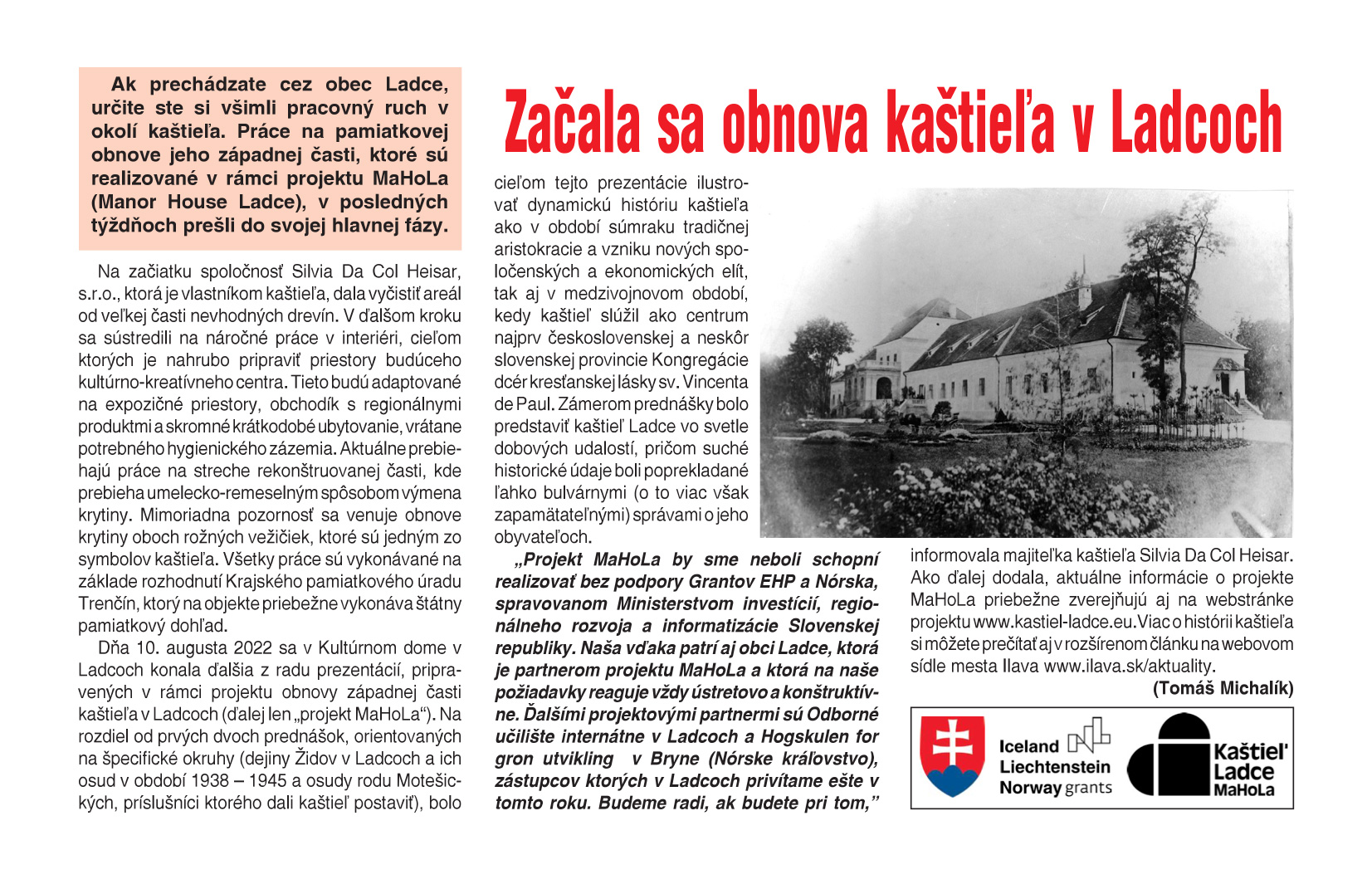 Seminár bol organizovaný v rámci projektu „Kaštieľ v Ladcoch (acronym MaHoLa)“, podporeného Grantom EHP a Nórska v rámci programu „Kultúra“, správcom ktorého je Ministerstvo investícií, regionálneho rozvoja a informatizácie Slovenskej republiky.